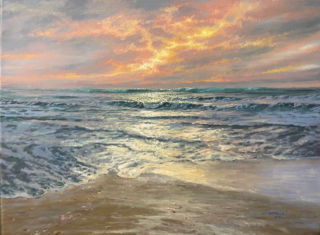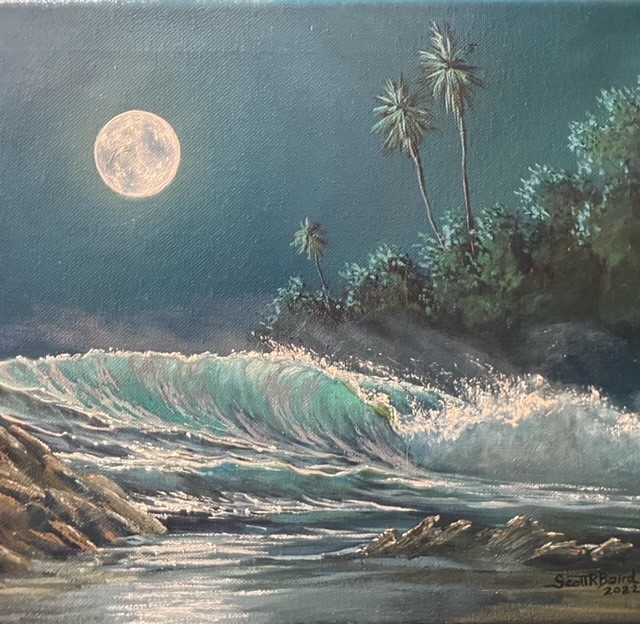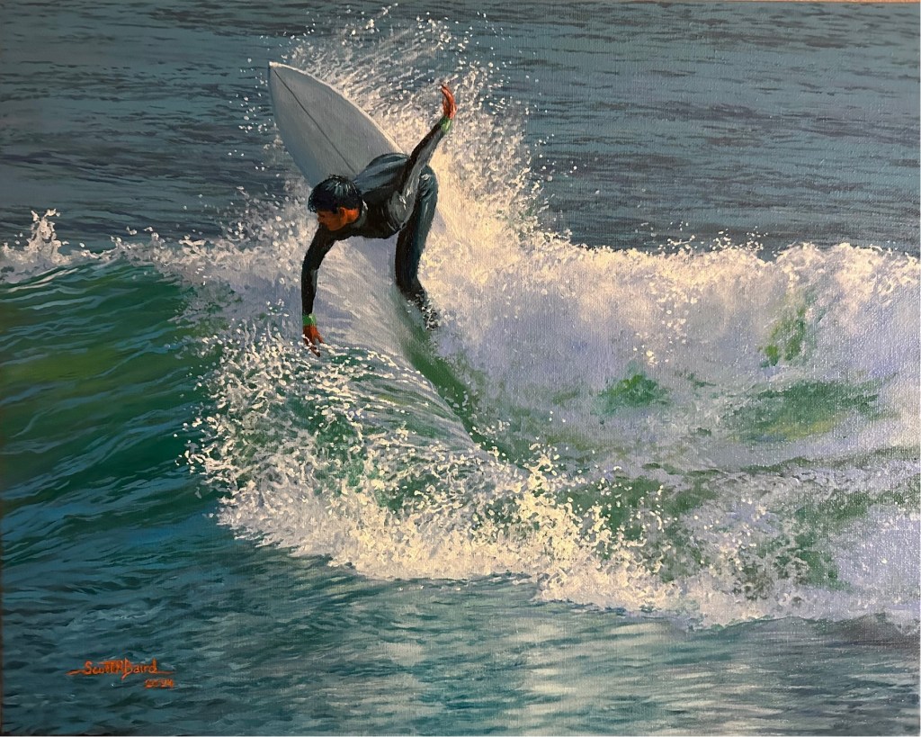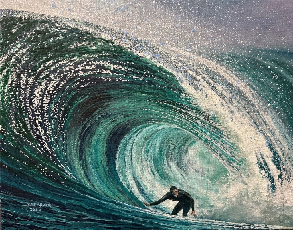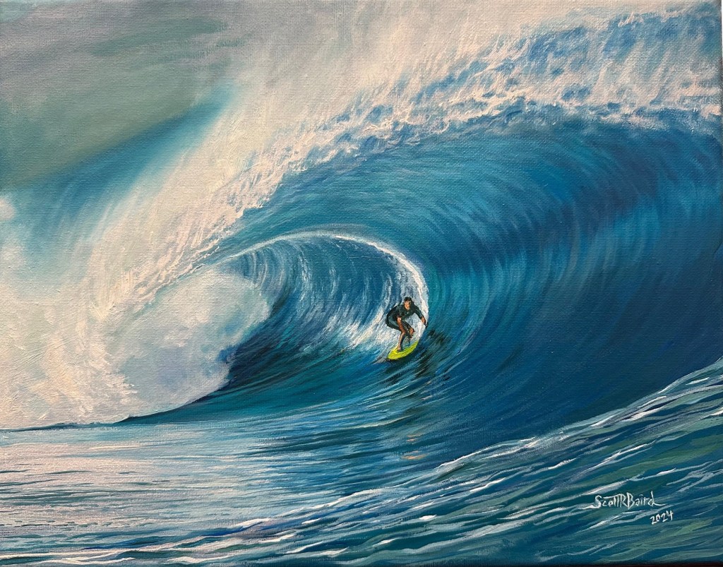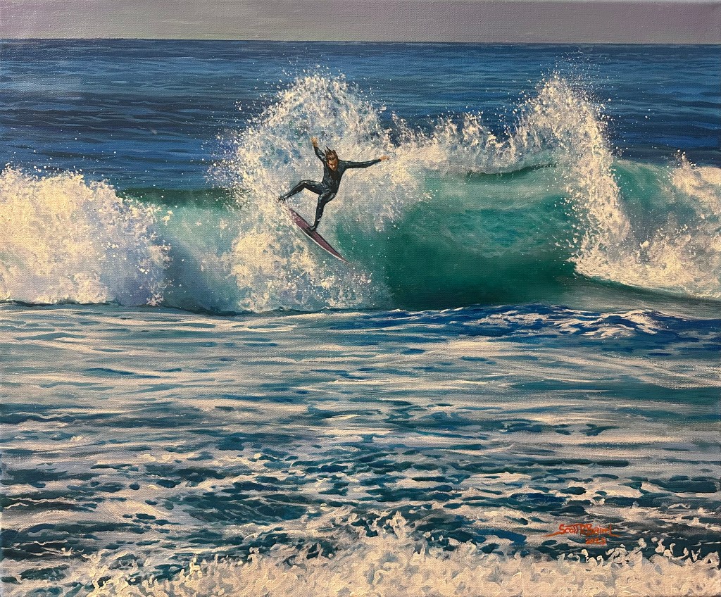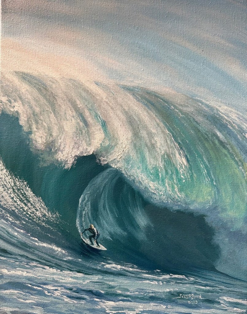 Thanks to a great musician and surfer, Skyler Lutes, for giving permission to paint this picture. 24″ x 18″, oil on canvas. — Sold