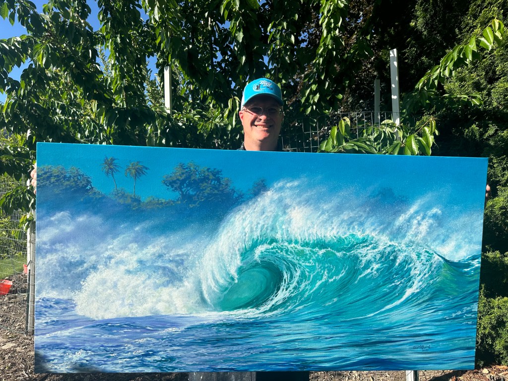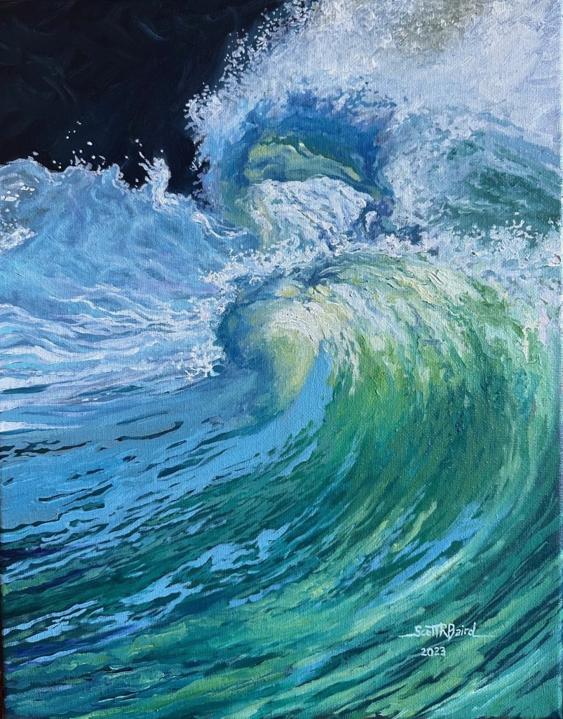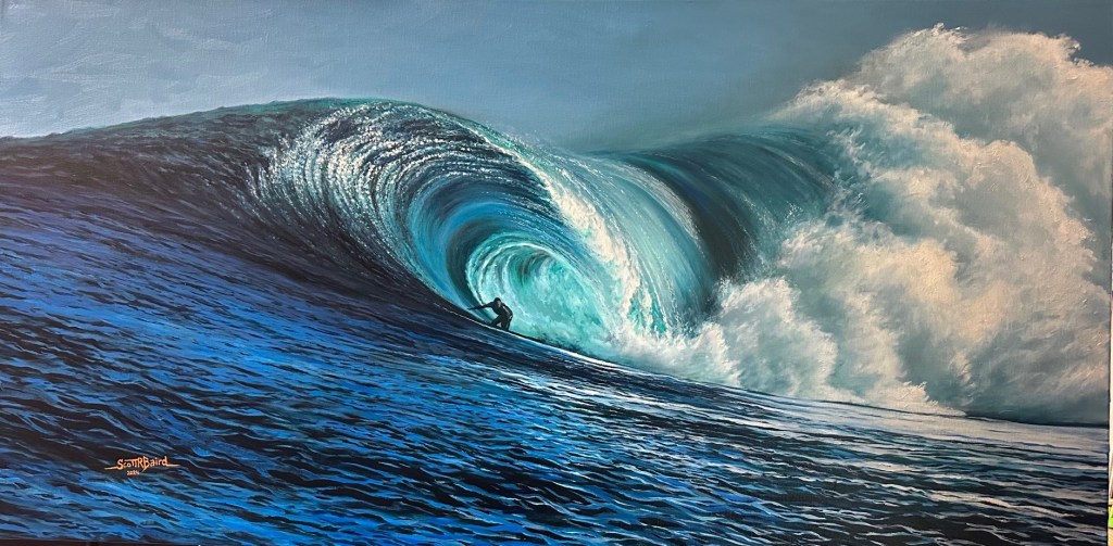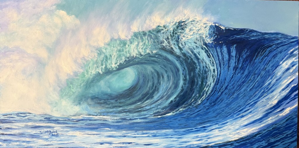 48″ x 24″ Oil on canvas — This is the largest surf painting I have ever done and turned out amazing. I loved painting all of the different shades of blue and green in the water. This wave just captivates me! — Sold