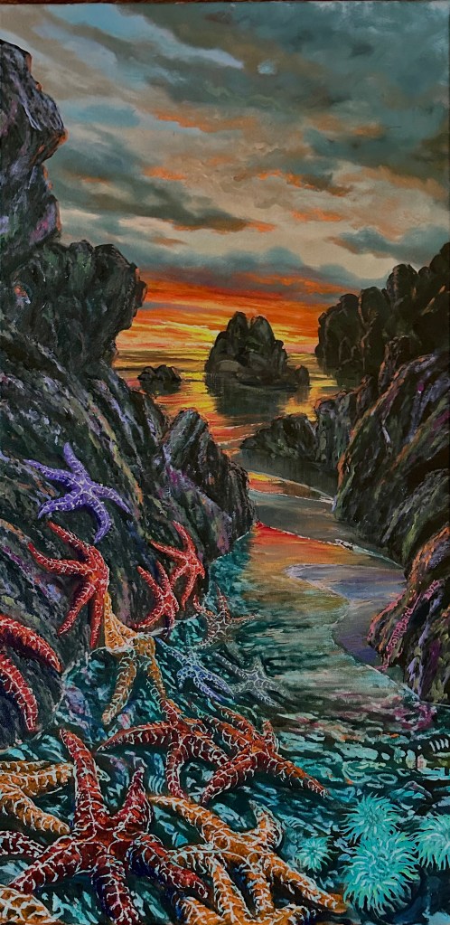 This painting of starfish was inspired by a vacation we took years ago. There in the tidepools, the starfish were more colorful and numerous than I ever imagined. – sold